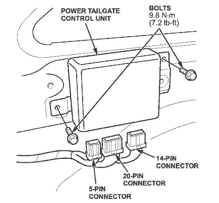 5. Install the new power tailgate control unit, and reconnect the connectors.