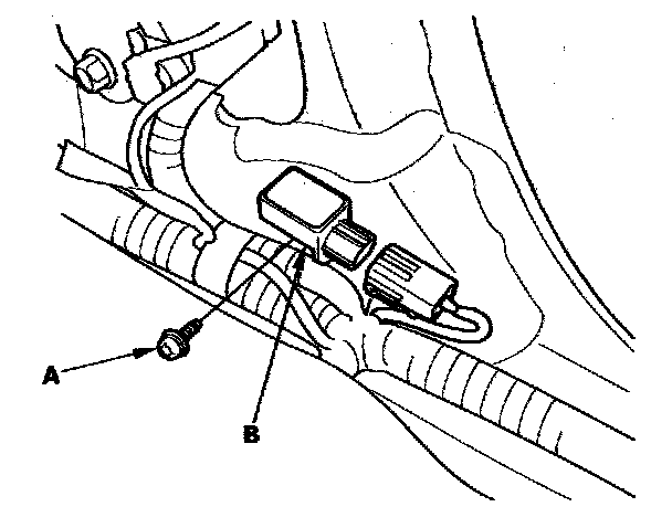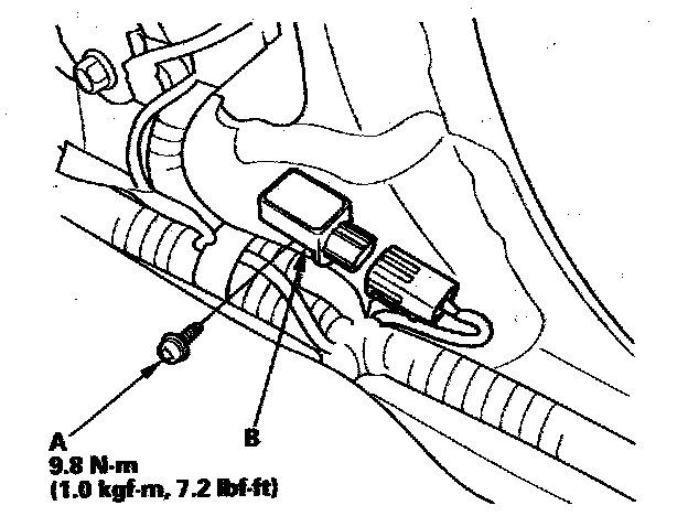 1. Install the new side impact sensor (first) with the TORX bolt (A), then connect the floor wire harness 2P connector (B) to the side impact sensor (first).