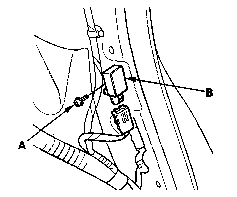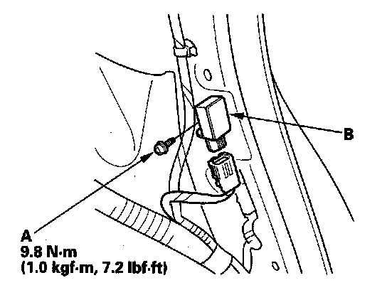 1. Install the new side impact sensor (second) with the TORX bolt (A) then connect floor wire harness 2P connector (B) to the side impact sensor (second).
