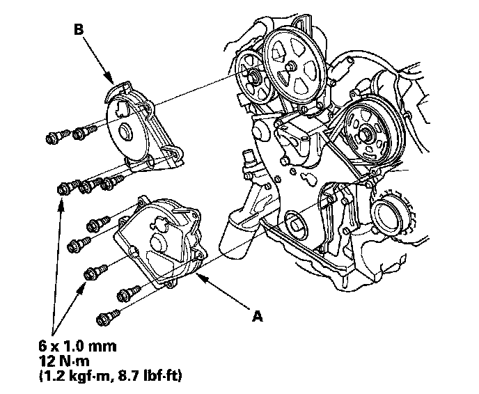Mark the bolt head (D) and crankshaft pulley (E) as shown, then tighten the bolt an additional 60° (The mark on the bolt head lines up with the mark on the crankshaft pulley).