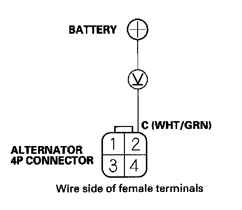 7. Measure the voltage between alternator 4P connector terminal No. 2 and the positive terminal of the battery.