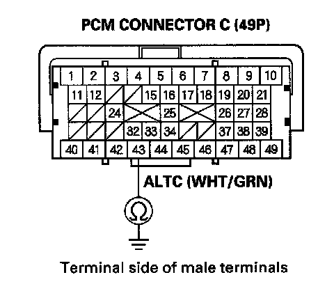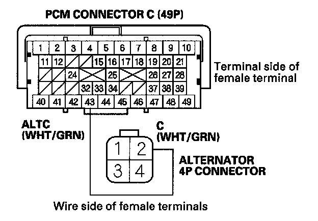 13. Check for continuity between PCM connector terminal C43 and alternator 4P connector terminal No. 2.
