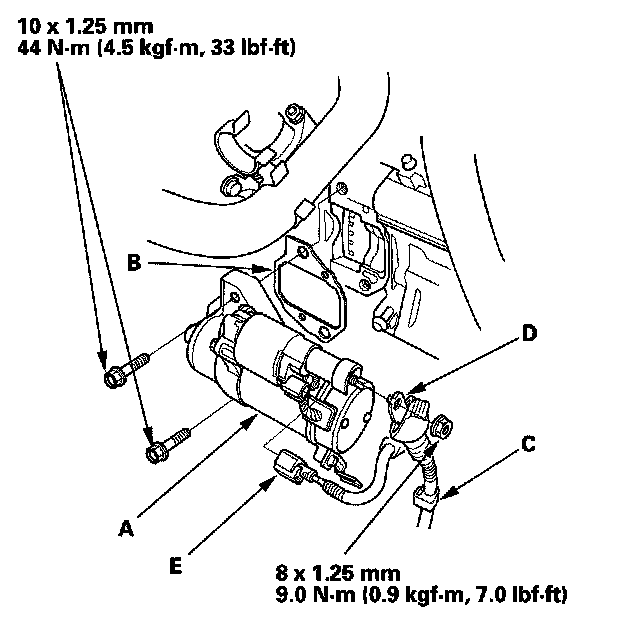 1. Install the starter (A) using a new gasket (B), then install the harness clamp (C), and positive starter cable (D) and S terminal connector (E). Make sure the crimped side of the B terminal is facing out, away from the starter.