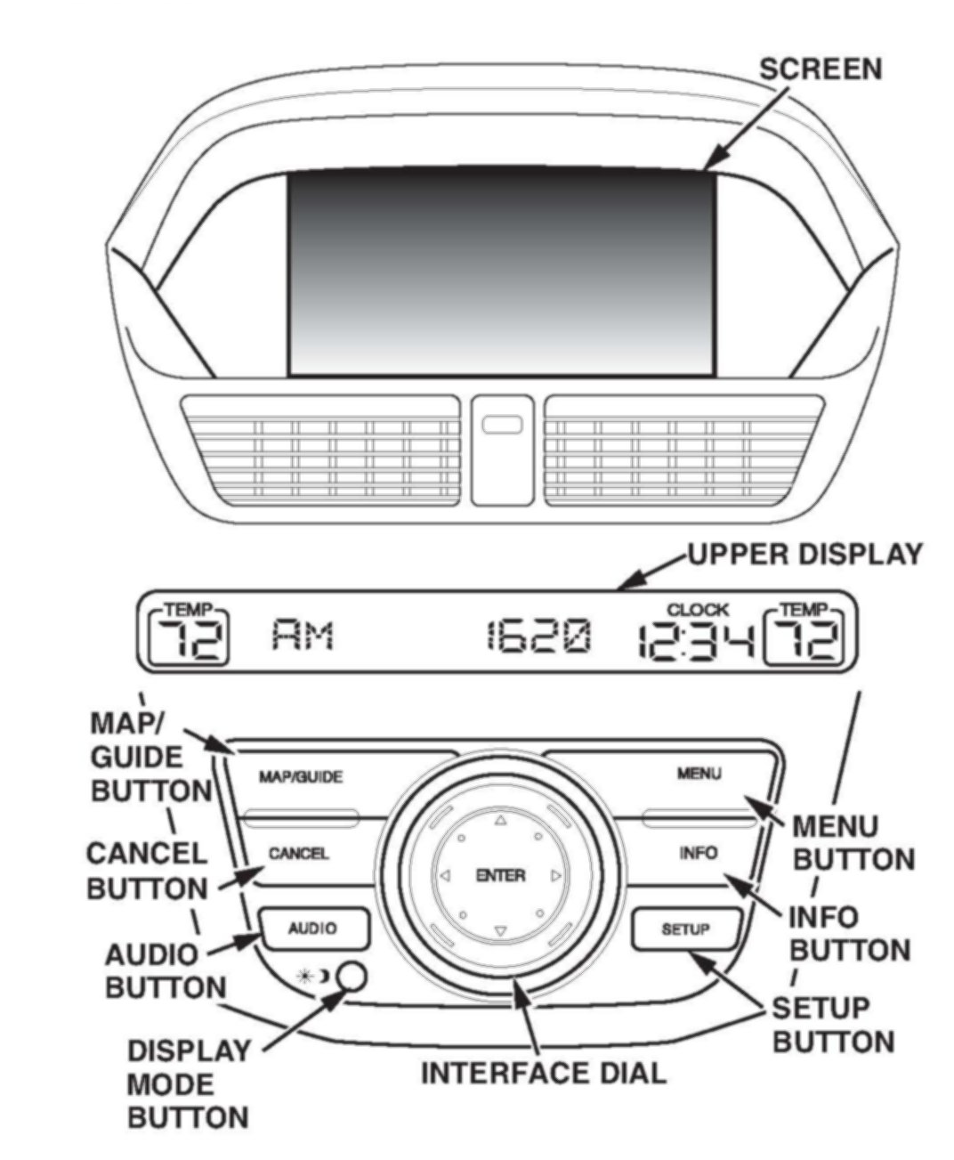Upper Display - Shows the radio information, the climate control information, and the time. MENU button - Press this button to change the display from the current screen to the Enter destination by screen. When en route to a destination, press this button to change to the Change route by screen.
