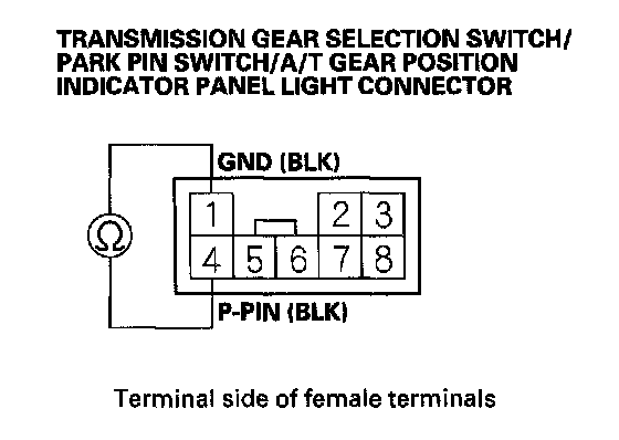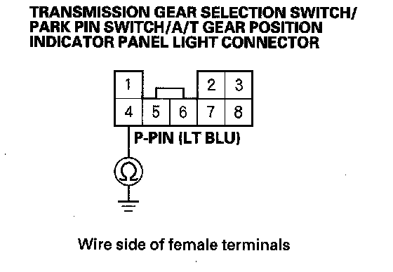 9. Check for continuity between transmission gear selection switch/park pin switch/A/T gear position indicator panel light connector terminal No. 4 and body ground.