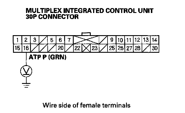14. Measure the voltage between multiplex integrated control unit 30P connector terminal No. 16 and body ground.