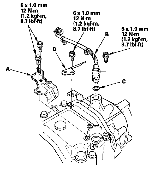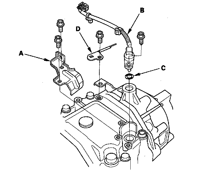 3. Remove the differential fluid temperature sensor cover (A) rear differential fluid temperature sensor (B) O-ring (C) and rear differential harness bracket (D).