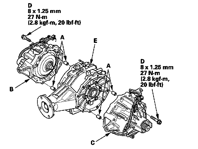 7. Install the 8 x 12 mm dowel pins (A) the rear differential right side case (B) the rear differential left side case (C) and the mounting bolts (D) on to the rear differential center case (E).