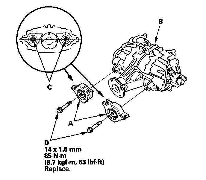 NOTE: Install a lower surface of the guide (C) horizontally as shown, then tighten the rear differential front mounting bracket bolts (D).