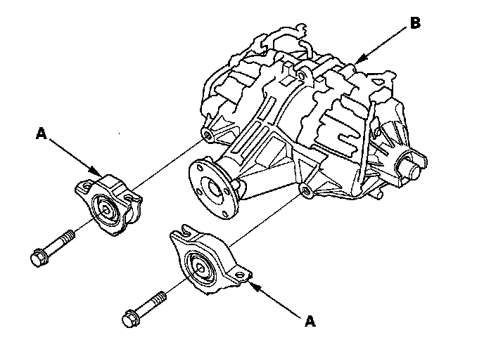 2. Remove the rear differential front mounting brackets (A) from the rear differential (B).