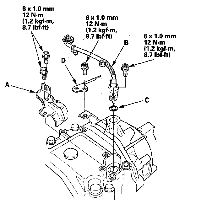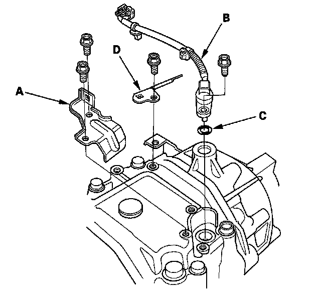 3. Remove the differential fluid temperature sensor cover (A) rear differential fluid temperature sensor (B) O-ring (C) and rear differential harness bracket (D).