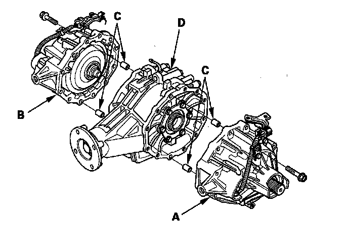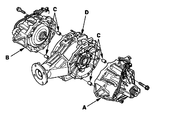 14. Remove the rear differential left side case (A) or the rear differential right side case (B) the 10 x 12 mm dowel pins (C) from the rear differential center case (D).