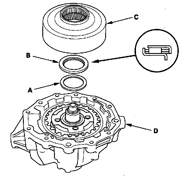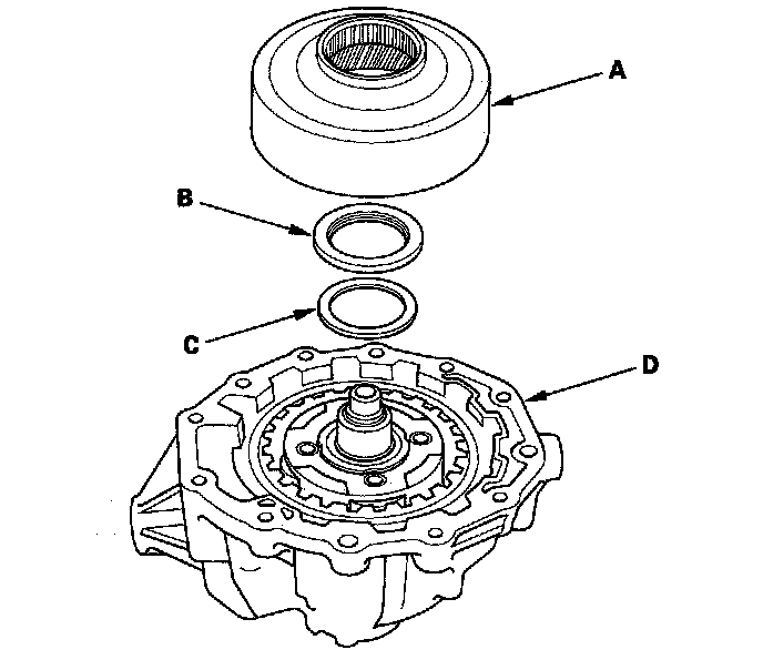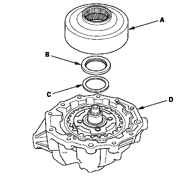 6. Remove the ring gear (A) needle bearing (B) and the 60.2 mm shim (C) from the rear differential side case (D).