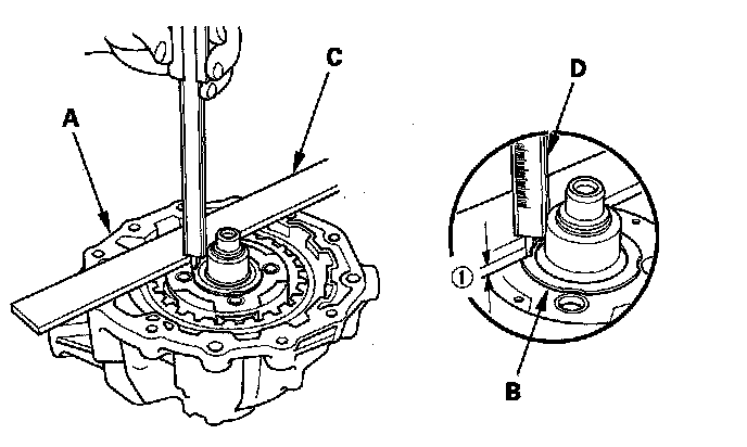 7. Measure distance (1) between the end of the rear differential side case (A) and 60.2 mm shim contact area of planetary gear (B) with a straight edge (C) and depth gauge (D). Measure at three locations, and average the reading.
