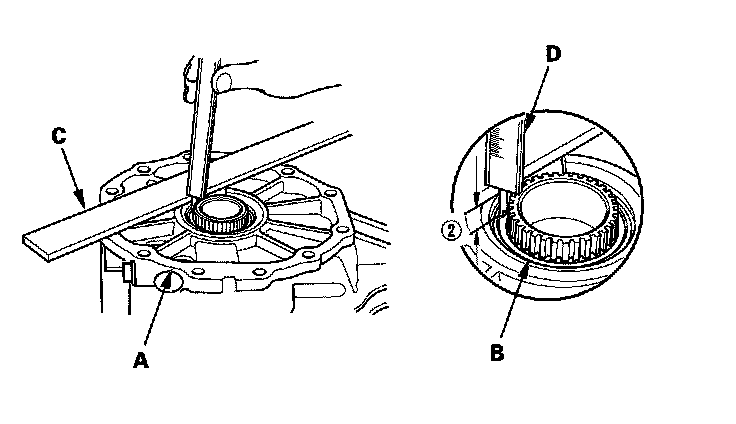 8. Measure distance (2) between the end of the rear differential center case (A) and ring gear contact area of taper roller bearing (B) with a straight edge (C) and depth gauge (D). Measure at three locations, and average the reading.