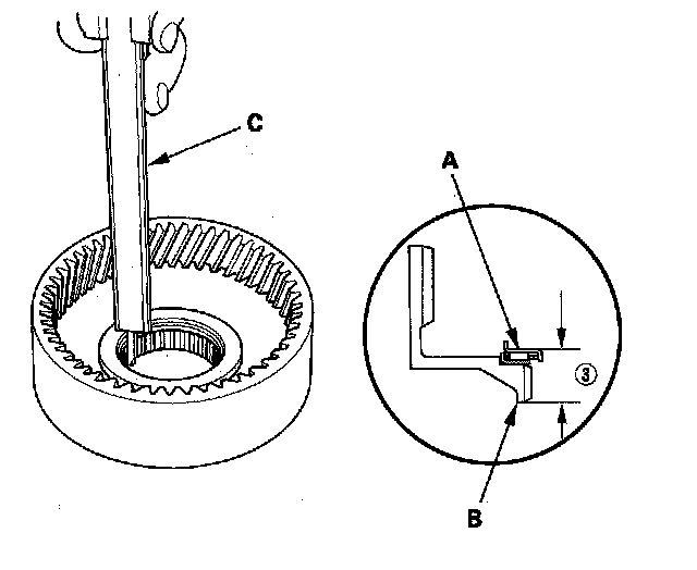 9. Measure the distance (3) between the needle bearing (A) and tapper roller bearing contact area of ring gear (B) with a depth gauge (C). Measure at three locations, and average the reading.