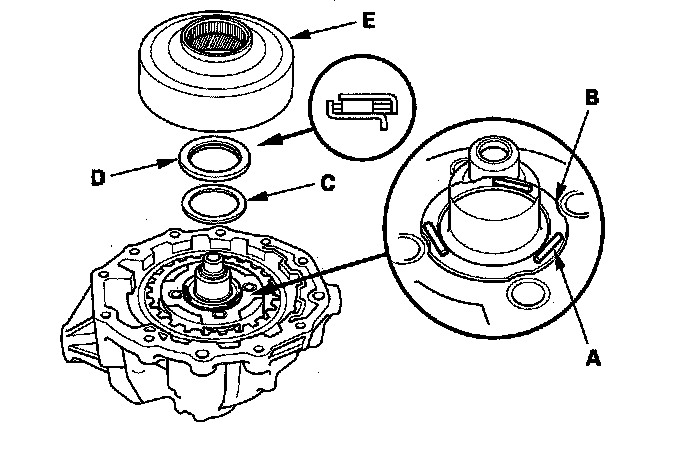 11. Place one strip of plastigage (A) on 60.2 mm shim contact area of planetary gear (B). Install the 60.2 mm shim (C) needle bearing (D) and the ring gear (E). Measure at three locations, and average the reading.