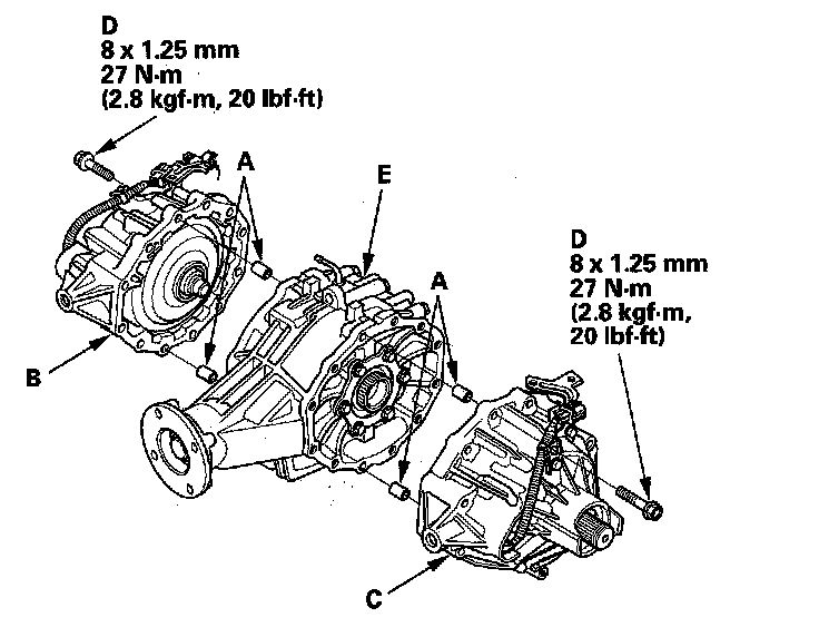 20. Install the 8 x 12 mm dowel pins (A) the rear differential right side case (B) or the rear differential left side case (C) and the mounting bolts (D) onto the rear differential center case (E).