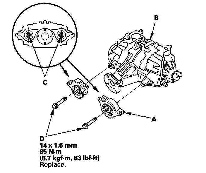 NOTE: Install a lower surface of the guide (C) horizontally as shown, then tighten the rear differential front mounting bracket bolts (D).