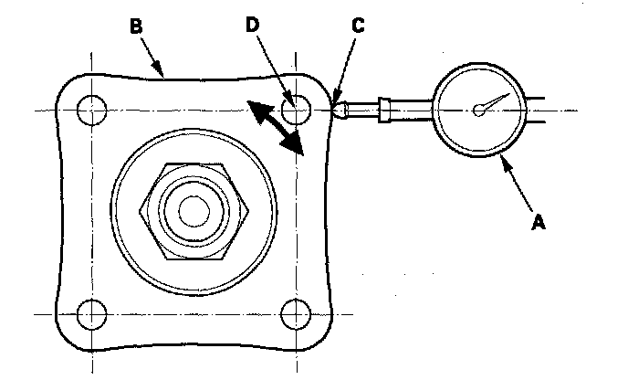 1. Set a dial indicator (A) on the transfer companion flange (B); position dial indicator tip (C) on the direct extension of the bolt hole center (D).