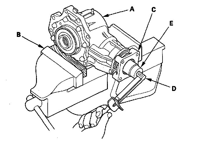 5. Measure the starting torque at the companion flange (C) with a torque wrench (D) and a socket (E).