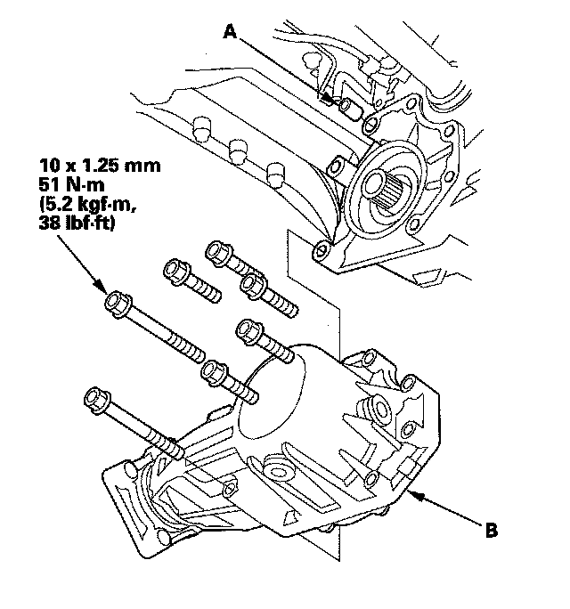 2. Install the dowel pin (A) in the transmission, and install the transfer assembly (B) on the transmission.