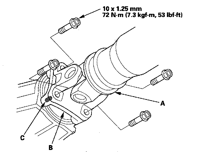 3. Install the propeller shaft (A) to the transfer companion flange (B) by aligning the reference mark (C).