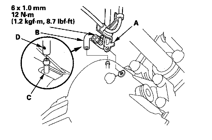 4. Secure the transfer breather hose bracket (A) on the transfer assembly with the bolt, and install the breather hose (B) over the breather pipe (C) with the dot (D) facing out.