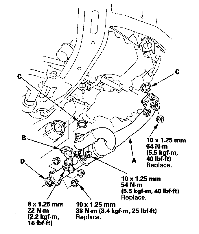 5. Install the exhaust pipe A with the new self-locking nuts, its mount (B) and new gaskets (C) (D).