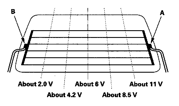 1. Measure the voltage between the positive terminal (A) and body ground with the ignition switch and defogger switch ON.