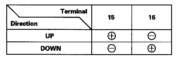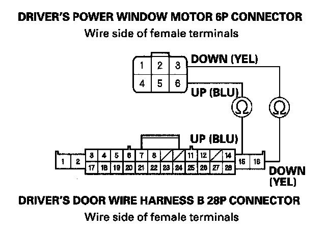 2. At the driver's door wire harness B 28P connector, test the power window motor in each direction by connecting battery power and ground according to the table.When the motor stops running, disconnect one lead immediately.