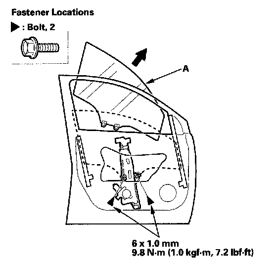 4. Carefully raise the glass (A) until you can see the bolts, then remove them. Carefully pull the glass out through the window slot. Take care not to drop the glass inside the door.