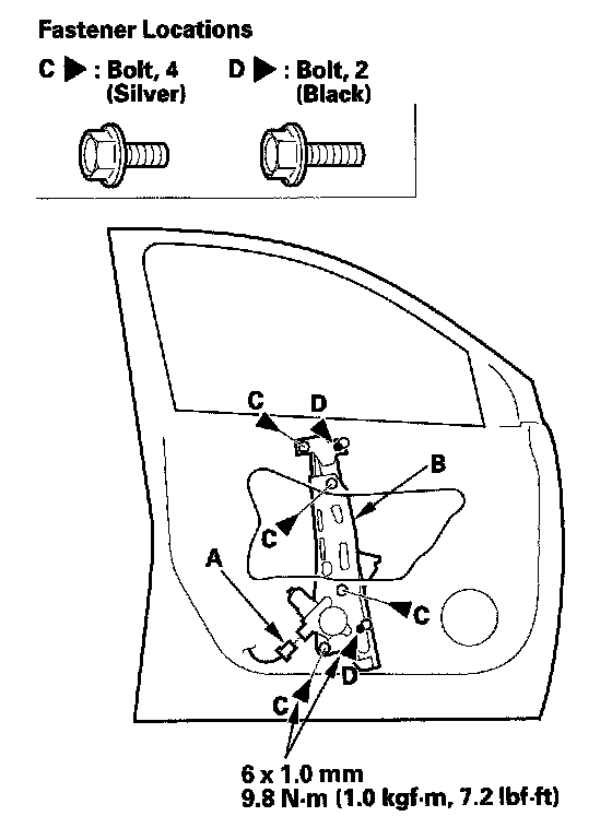 6. Remove the bolts (C), and loosen the bolts (D), then remove the regulator through the hole in the door.