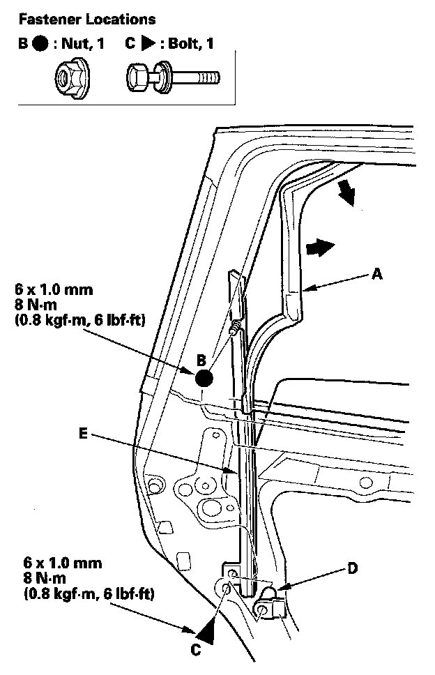 5. Pull the glass run channel (A) away as needed. Loosen the nut (B), and remove the bolt (C) and collar (D) from the rear lower channel (E).