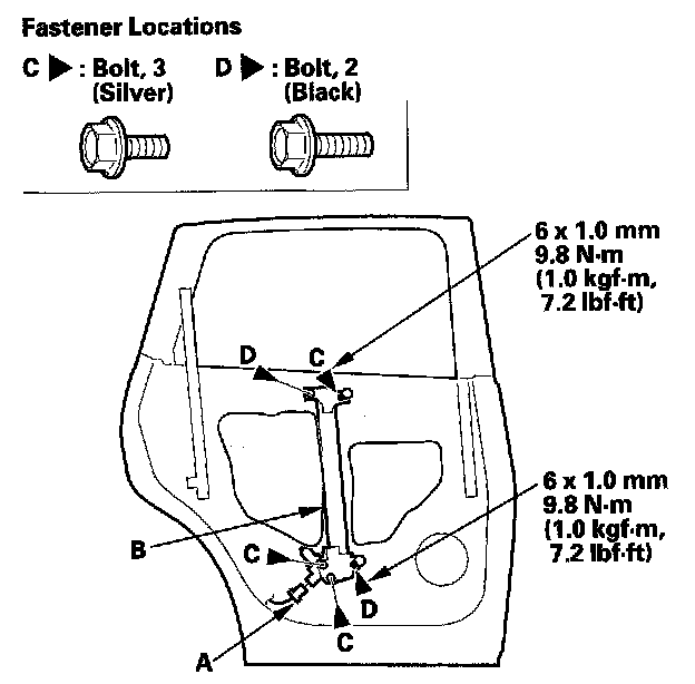 10. Remove the bolts (C), and loosen the bolt (D), then remove the regulator through the hole in the door.