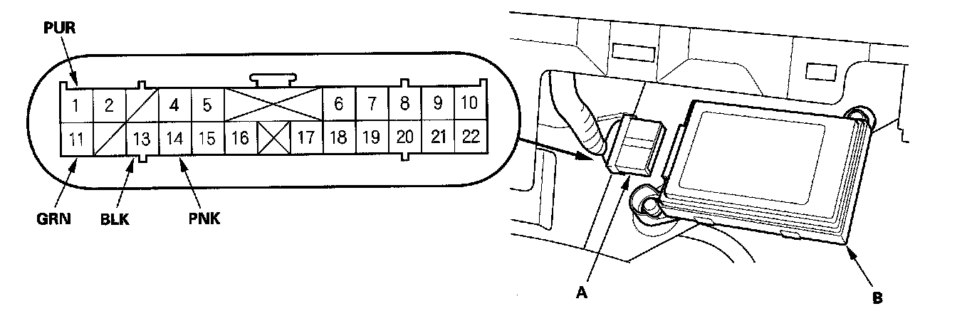 2. Disconnect the 22P connector (A) from the HandsFreeLink control unit (B).