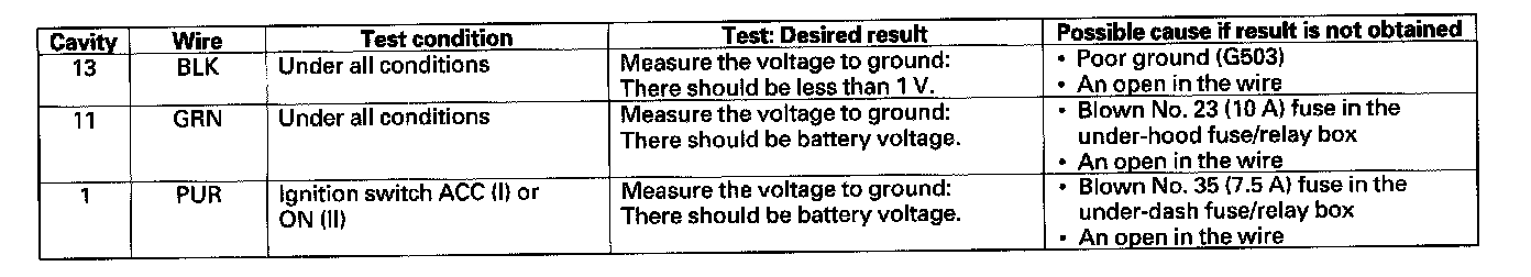 4. Reconnect the connector, and make these input tests at the connector.