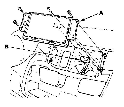 3. Disconnect the connector (B) and remove the navigation display unit.