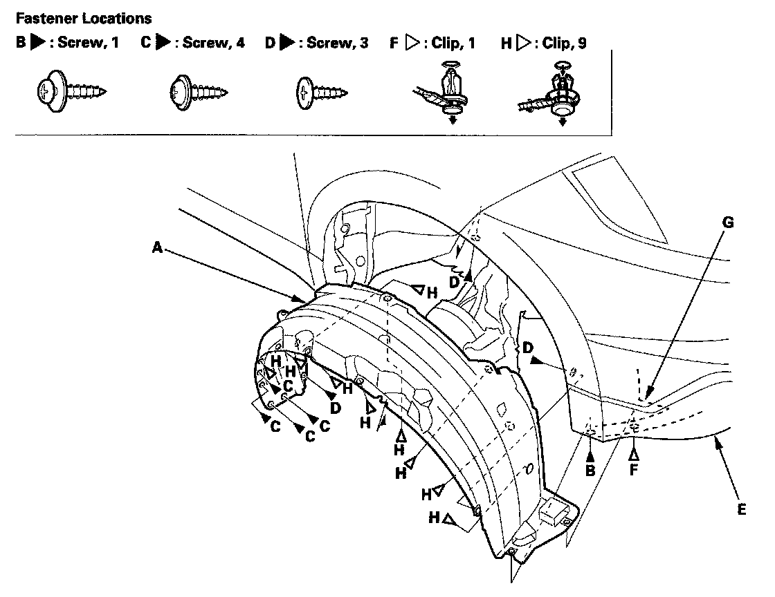 3. From the wheel arch, remove the clips (H) securing the front inner fender (and splash shield) to the body.