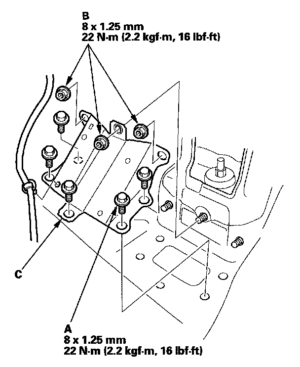 2. Remove the bolts (A) and nuts (B), then remove the rear damper gusset (C).