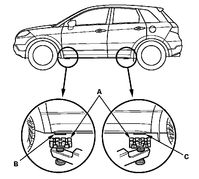 1. Position the hoist lift blocks (A) under the vehicle's front support points (B) and rear support points (C).