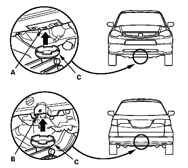3. Position the floor jack under the front jacking bracket (A) or rear jacking bracket (B), center the jacking bracket in the jack lift platform (C), and jack up the vehicle high enough to fit the safety stands under it.