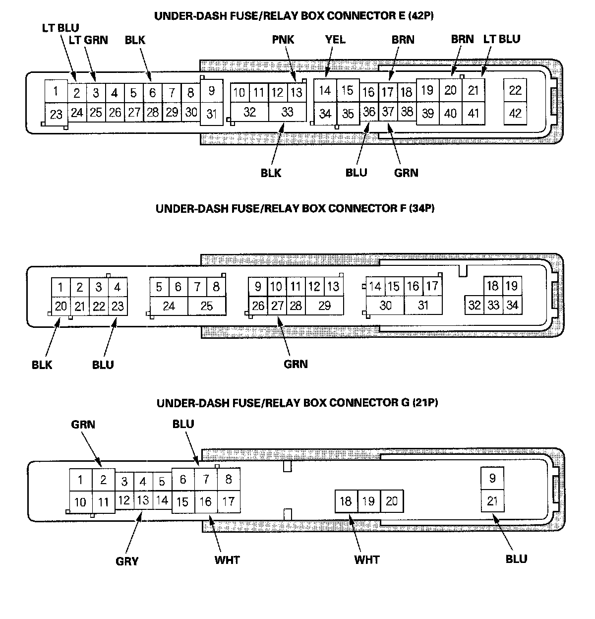 3. Disconnect the under-dash fuse/relay box connectors E, F, G, M, N, Q, R, and T.