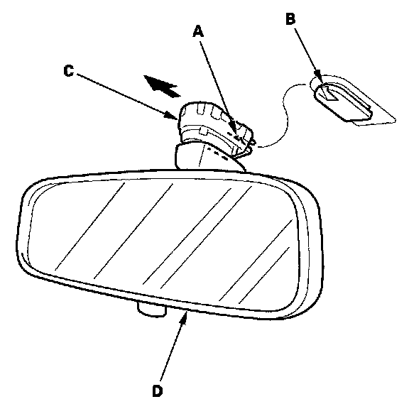 2. Pull the hook (A) down to release it from the mount (B), and slide the mirror base (C) rearward, then remove the rearview mirror (D).