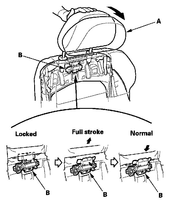 1. Push the head restraint (A) forward fully from the locked position to return the inside inertia lock (B).