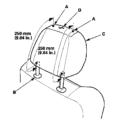 5. Make marks (A) on both sides at 250 mm (9.84 in.) upward from the roots of the head restraint frame (B) along the back of the head restraint (C) surface. Make a center of these points as a datum point (D).