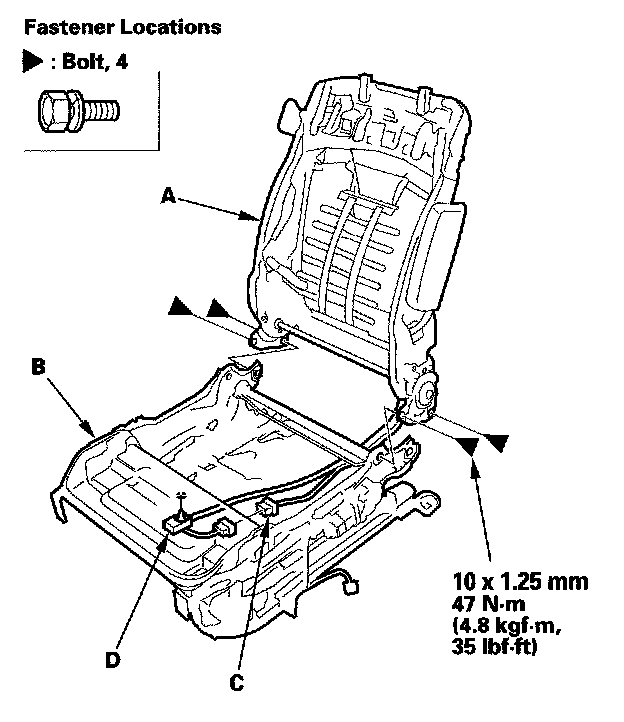 8. Install the new seat frame in the reverse order of removal, and note these items: