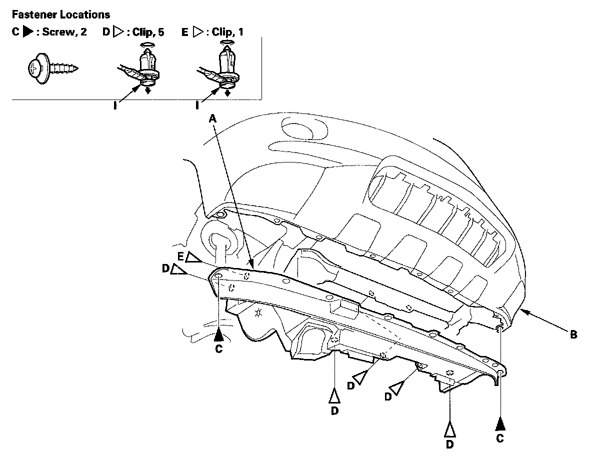 NOTE: To remove the clips C and D, pry the inner the clip up at the edge near the line (I) on its head.