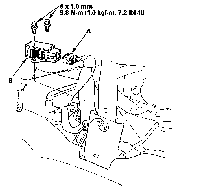 4. Remove the sensor mounting bolts, and remove the yaw rate-lateral acceleration sensor (B).