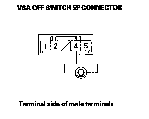 5. Check for continuity between VSA OFF switch 5P connector terminal No. 4 and No. 5. There should be continuity at all times.